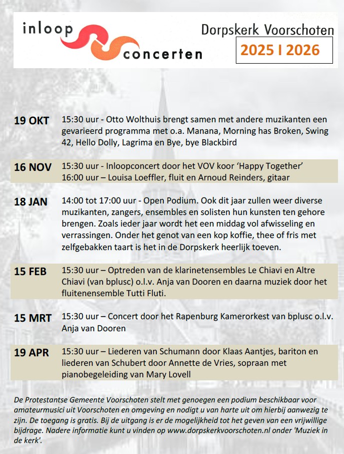 ![]() Voor diverse concerten in Voorschoten (zowel in de kerken als daarbuiten) zie de website van de Cultuurfabriek. |
